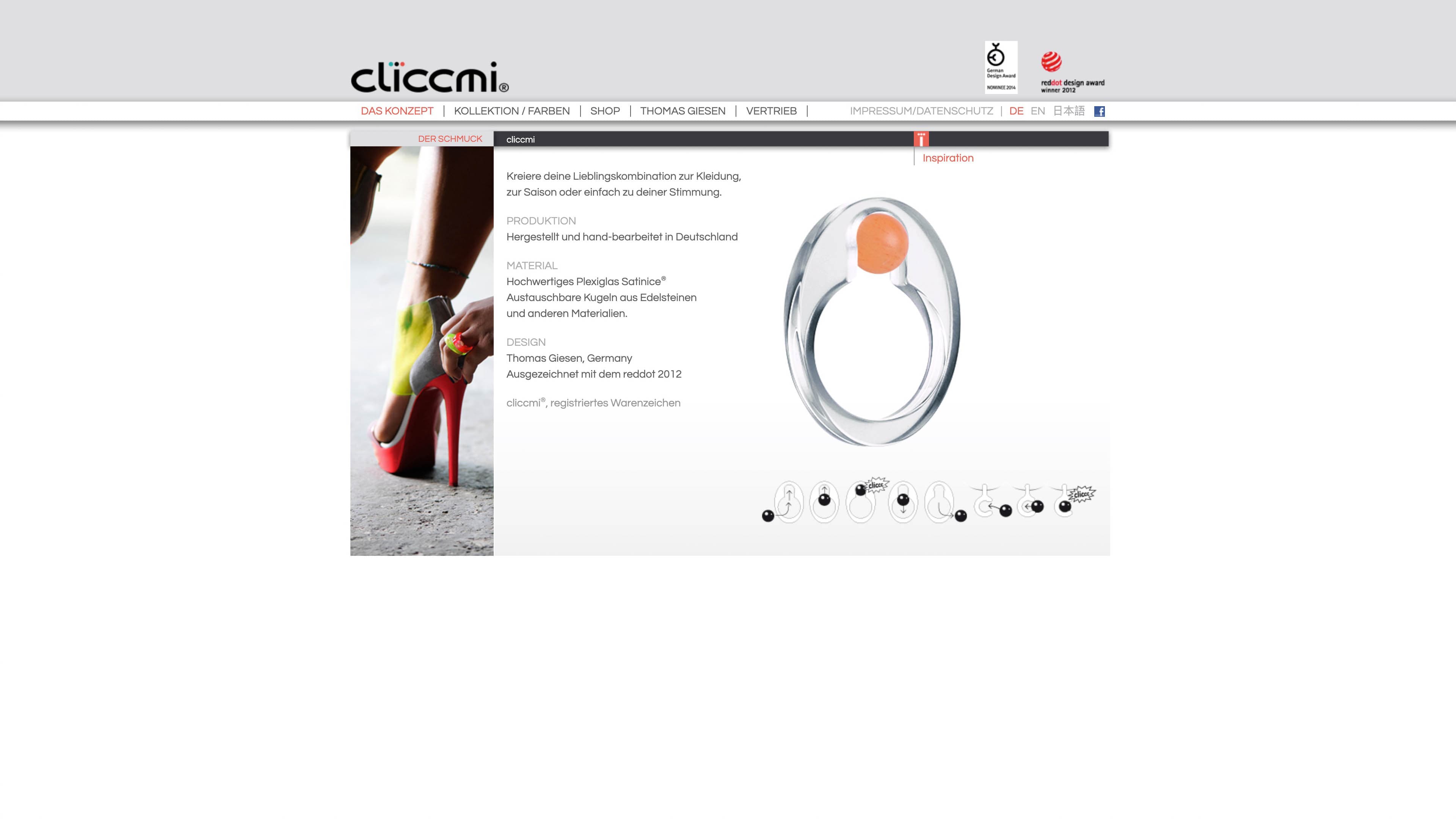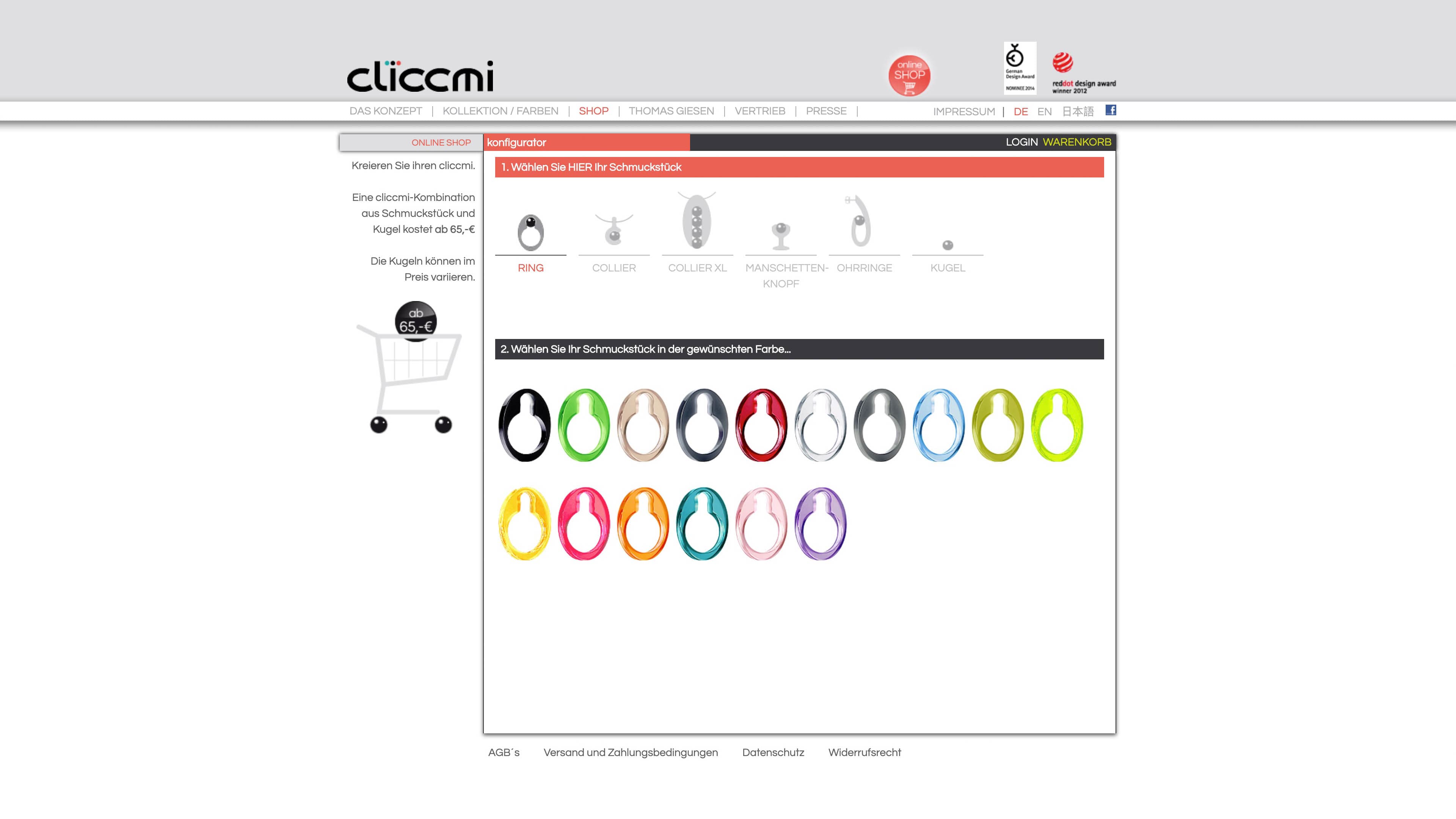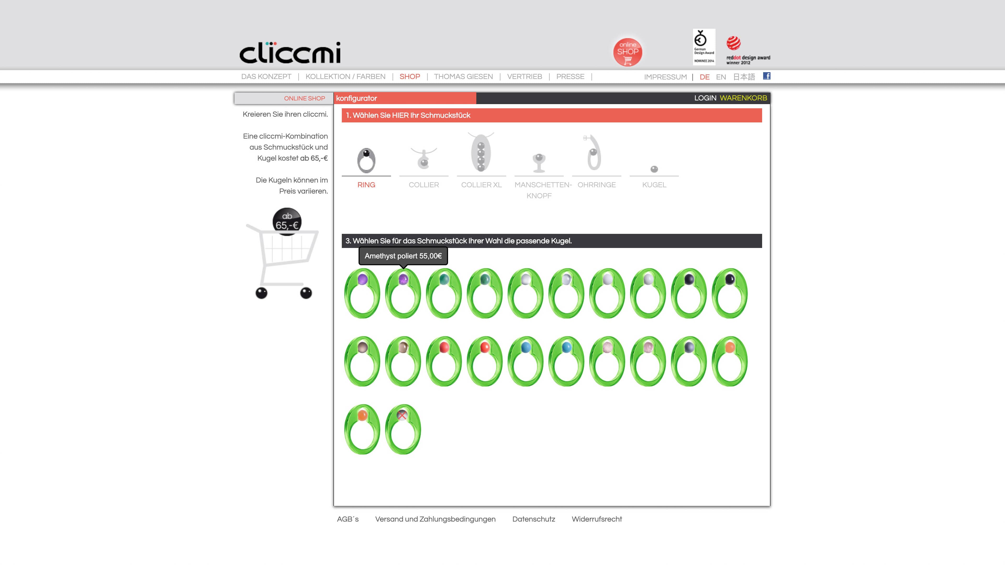 Ein ungewöhnlicher Shop für ein ungewöhnliches Schmuckstück. Als Kunde konfigurieren Sie sich Schmuckstücke und passende cliccmi-Kugel individuell.